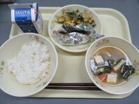 ごはん 牛乳 白身魚の抹茶マヨネーズ焼き 小松菜とベーコンの炒め物 豆腐と油揚げの味噌汁