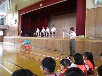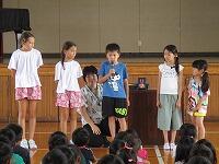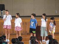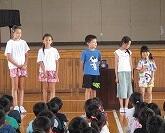 今、西方小には、海外で暮らしている小学生5人の友達が、体験入学しています。今日は、全校の前で、自己紹介をしてもらいました。