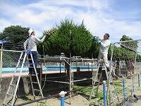 本日(土曜日)の早朝から、西方小「おやじの会」の皆さんが、ボランティアで来校されています。今回は、プールの東側に並んでいる樹木の剪定作業のために集まってくださいました。