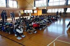 2月3日に避難訓練を行いました。今回は校内放送が使えないという状況で、大声やハンドマイクでの通告で、体育館に避難するという想定で訓練を行いました。判断の難しい状況で、自分の命は自分で守る行動をとることができました。