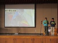 次に、「小さな親切運動」の実践発表をしてもらいました。1月25日(土)に、栃木東中学校で、「栃木市『小さな親切運動』実践報告会」が行われました。そこに、西方小の6年生の代表児童が参加し、日ごろ学校で行っている活動をまとめ、市内の44校の前で発表してきました。