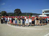 ▼運動会が終わって、赤組も白組も、勝ち負けにかかわらず一つの輪になって「ノーサイド」…6年生の姿です。