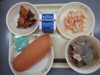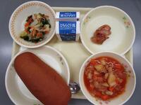丸パンスライス 牛乳 白身魚のフライ もち麦入りミネストローネ 野菜とかまぼこのソテー