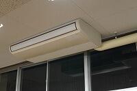 火災を感知すると、自動的に防火扉が閉まり、煙の拡散を防ぎます。防火扉が閉まっても真ん中の小さな扉から避難が可能です。