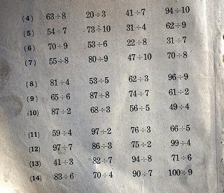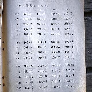 今回も昔の教科書を紹介いたします。昭和12年発行の「尋常小学算術」第3学年児童用の教科書です。定価が13銭と記されています。かけ算とわり算の計算練習問題が掲載されていました。80年以上前の小学校3年生のかけ算とわり算は現在の3年生の内容と全く同じであることがわかりました。