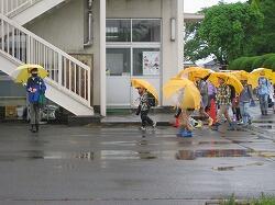 昇降口扉の前では、傘の水気をパタパタと取っていました。