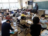 西方小学校では毎週火曜日は集会タイムがあります。今日は全校集会がありました。例年ですと全校生が体育館に集合して、校長先生のお話を聞いていますが、今年は3密をさけるため各教室の大型テレビで生放送を視聴する形で行いました。YouTubeで生配信される映像により全児童が全校集会に参加しました。