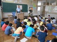 絵の具の使い方の学習として「にじ色の魚」に取り組んでいます。パレットに絵の具を出すときのルールや、水入れで筆洗いをする順番、太筆と細筆の使い方等、全体で確認しながら活動しています。