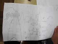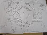 「あったらいいな、未来の街」こんな町があったら楽しいな、すてきだなと思う街の絵の下絵です。とても細かい絵を描いていましたよ花がいっぱいの街、イルカやクジラが悠々と泳ぐ街、空を飛ぶ車が行きかう街…実現しそうな街の未来設計ができました