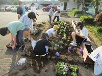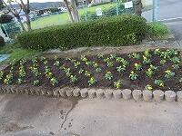 昇降口前の花壇の雑草を抜いてから、パンジーの苗を植えました「きゃ~~虫~~