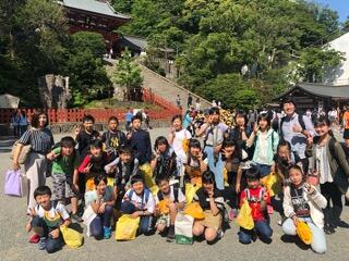 ▼1年生が、ほうきでごみを集めるのを、5年生が手伝っています。
