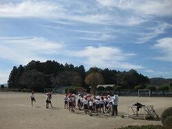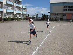 3年生の体育は、持久走の練習です。青空の下、白砂の校庭を走っていました。