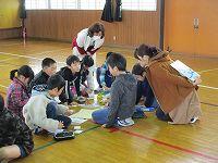 今日の業間の時間には、体育館に、なかよし班ごとに集まって、6年生へのメッセージ書きをしました。