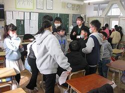地震発生による火災を想定し、机の下の潜って頭(脊髄)を守る、頭を低くしてハンカチで口を覆って吸煙を防ぐ、避難経路を確認して覚えるなどの訓練をしました