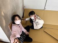 結束バンドを使って上手に段ボールを繋げたり、段ボールカッターで大きな段ボールに切り込みを入れたりするなど、分担しながら作業していました。