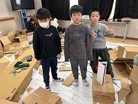 子供たちは朝からやる気満々!給食室や保護者の皆さんに協力していただいて集めた段ボールたちを、協力して会議室に運び込みました。