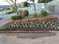 昇降口前の花壇の雑草を抜いてから、パンジーの苗を植えました「きゃ~~虫~~