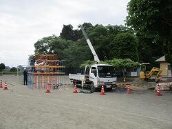 老朽化したジャングルジムを撤去し、新しいジャングルジムを設置する工事が進められています。ピカピカのジャングルジムを見て、児童も「早く登りた~い」と興奮ぎみでした