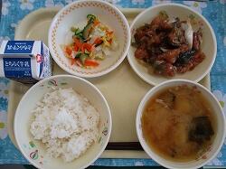 ごはん ぎゅうにゅう あじのカレーみそやき ひじきとじゃがいものにもの いなかじる