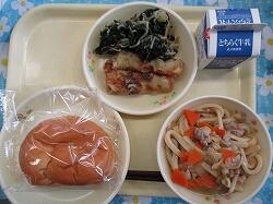 ごはん ぎゅうにゅう とりにくとごぼうのかりんあげ うめあえ あおさのみそしる