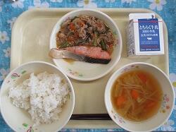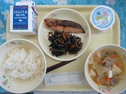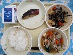 ごはん ぎゅうにゅう ひじきのにもの さけのさいきょうやき とんじる はとくちのけんこうしゅうかんゼリー