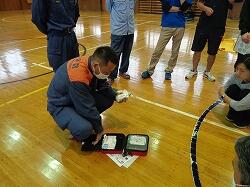 まる栃木市消防本部西方分署の署員5名の方をお招きして、心臓マッサージの仕方やAEDの使い方を教えていただきました。