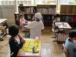 1年生は、今日が初めての給食です。メニューは、大人気のカレーライスです。小さい子の味覚に合わせて、あまり辛くないように作ってくださいました。大きな窯でじっくり煮込んであります。熱々をいただきました