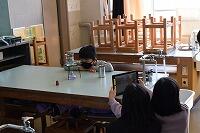 水が温まってくると絵の具が溶け出し、、どのように動いていくのか観察。水が上の方に上がっていくのが絵の具で色を付けることで分かってきました。