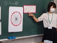 ホワイトボードを使い、4人→8人→28人と人数を増やしていき、丸い形ができていく過程について、多くの先生方が参観する中、子どもたちは、試行錯誤しながら一生懸命考えることができていました。