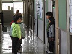 続いて、「校内探検」です。1年生が、年長組のみなさんを連れて、校舎内を探検しました。保健室や昇降口、それから、校長室や職員室にも入りました。