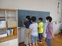 ホワイトボードを使い、4人→8人→28人と人数を増やしていき、丸い形ができていく過程について、多くの先生方が参観する中、子どもたちは、試行錯誤しながら一生懸命考えることができていました。
