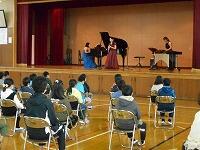 楽団は、「マレットリード・トリオ」の3名の方々です。楽器は、クラリネット、パーカッション、ピアノで、「情熱大陸」、「君をのせて」、「校歌」などを演奏していただきました。楽器に関するクイズや、リズム遊びなども取り入れていただき、楽しい会となりました。