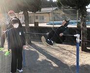 西方小では寒くなっても、たくさんの児童が休み時間に外で元気に遊んでいます。今、人気のある遊びはなわとびと鉄棒です。校舎前にあるなわとび練習用ジャンプ台は、順番待ちが出る程大人気です。そして、あや跳びや交差跳び、二重跳び等の技に挑戦していました。