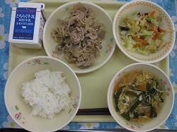 ごはん 牛乳 モロのスタミナ焼き 秋野菜の煮物 豆腐と大根の味噌汁 みかんゼリー