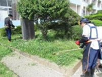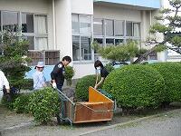 なれない草刈機や生垣バリカンを使い、なんとか校舎南側をきれいにしました。