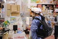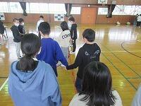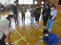 2時間目は、1組2組合同で体育館で「縁日」を行いました。子どもたちが遊び方を考え、自作した遊び道具を使って交流しました。修学旅行の活動班の中に入ってもらい、店員役とお客さん役に分かれて、「魚釣り」や「紙コップタワー」などの遊びを楽しみました。緊張することもなく積極的に交流することができ、子どもたちに笑顔があふれていました。