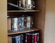 西方小学校の歴史をふり返るために理科室・図工室・教材倉庫などに行き写真を撮ってきましたが、忘れていた音楽準備室を訪れてみました。音楽準備室には、西方小学校で以前行われていた鼓笛隊で使われた物品が残されていました。