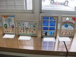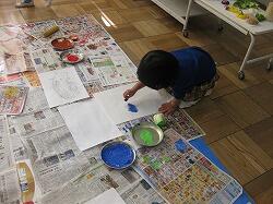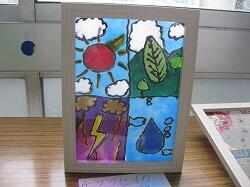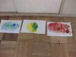 【3年生】図工です。絵の具とクレヨンで「にじみ絵」を描きました。水絵の具がきれいににじんで、淡い色味キラキラが出ていました。