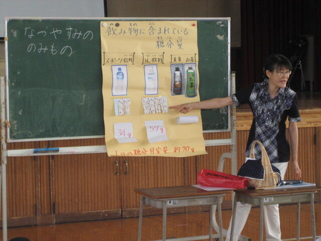 保健では、「熱中症予防の水分補給」。栄養では、「飲み物の糖分とおすすめの間食」を各担当教諭から話しました。