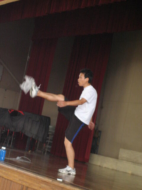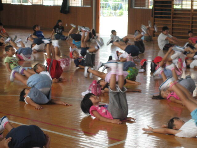 運動では、チャンピオン体操という体操の一部をみんなでやってみました。それとビニール袋でリフティングをするという運動を教えてもらい、6年生が見本になって30秒だけやってみました。ふわふわしたビニール袋を蹴るのは大きく足を上げなければならず、夢中で体を動かしていました。~頭の方にあった足をそのまま振っておろし起き上がる運動でした