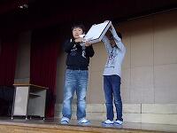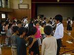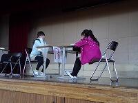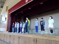 今日の業間に児童集会がありました。今回は、給食委員会と図書委員会の児童が発表をしました。はじめに給食委員会の発表です。食事のマナーやあいさつに関する劇を交えたクイズが出題されました。全児童がクイズに真剣に解答していました。