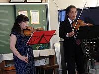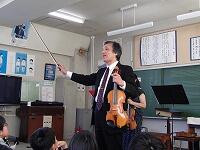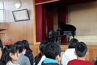 子ども達は、粂川吉美さん(バイオリン、ビオラ、歌)、粂川正子さん(バイオリン)、原口佐登子さん(ピアノ)の演奏に聴き入っていました。
