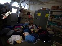 1年生はシェルターを作るのは大変なので、一番安全な窓のないスタジオに避難する訓練を行いました。
