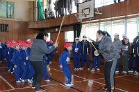 そこで、今回体育館に投てき力を高めるためのアイテムが設置されました。体育の時間の一部を使い、投げる力を高めるトレーニングを始めました。(児童が投げている円筒は、本来捨ててしまうはずの印刷機用マスターの芯を再利用したものです。)