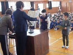 6年生のあいさつ名人に倣って元気にあいさつした後、まず表彰の伝達が行われました。