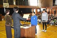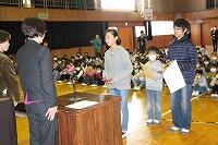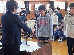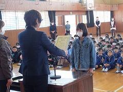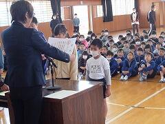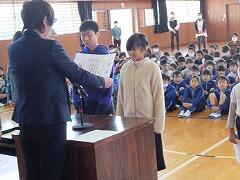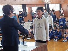 6年生のあいさつ名人に倣って元気にあいさつした後、まず表彰の伝達が行われました。
