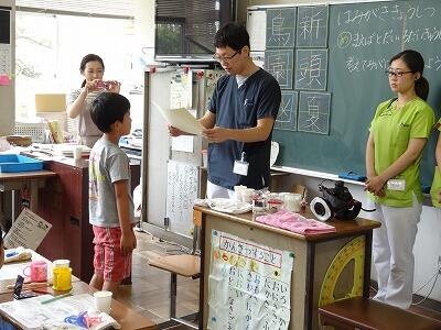 カリエスフリー(むし歯ゼロ)の表彰では歯科医に表彰され誇らしそう