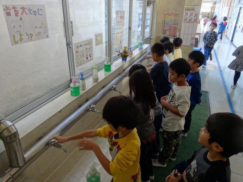 また、併せて業間後、給食前、掃除の後に手洗い歌を流し、上手に手が洗えるようにしています。1年生に歌を教えると、手を洗いながら元気に歌う姿が...!