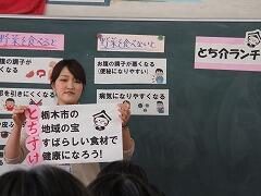 11月20日(月曜日)の4校時に、「健康によい食事のとり方」という題材名で、担任の他に学校栄養士・ニラ生産者にも指導者として加わっていただくティームティーチングによる学級活動の授業を行いました。