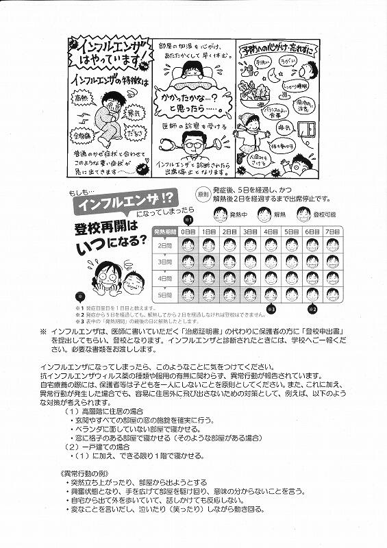 インフルエンザが7学級に広がりました。また、1年1組、2年2組、5年1組では、相変わらずインフルエンザ・病気欠席が多いので、特に気をつけてほしいと思います。